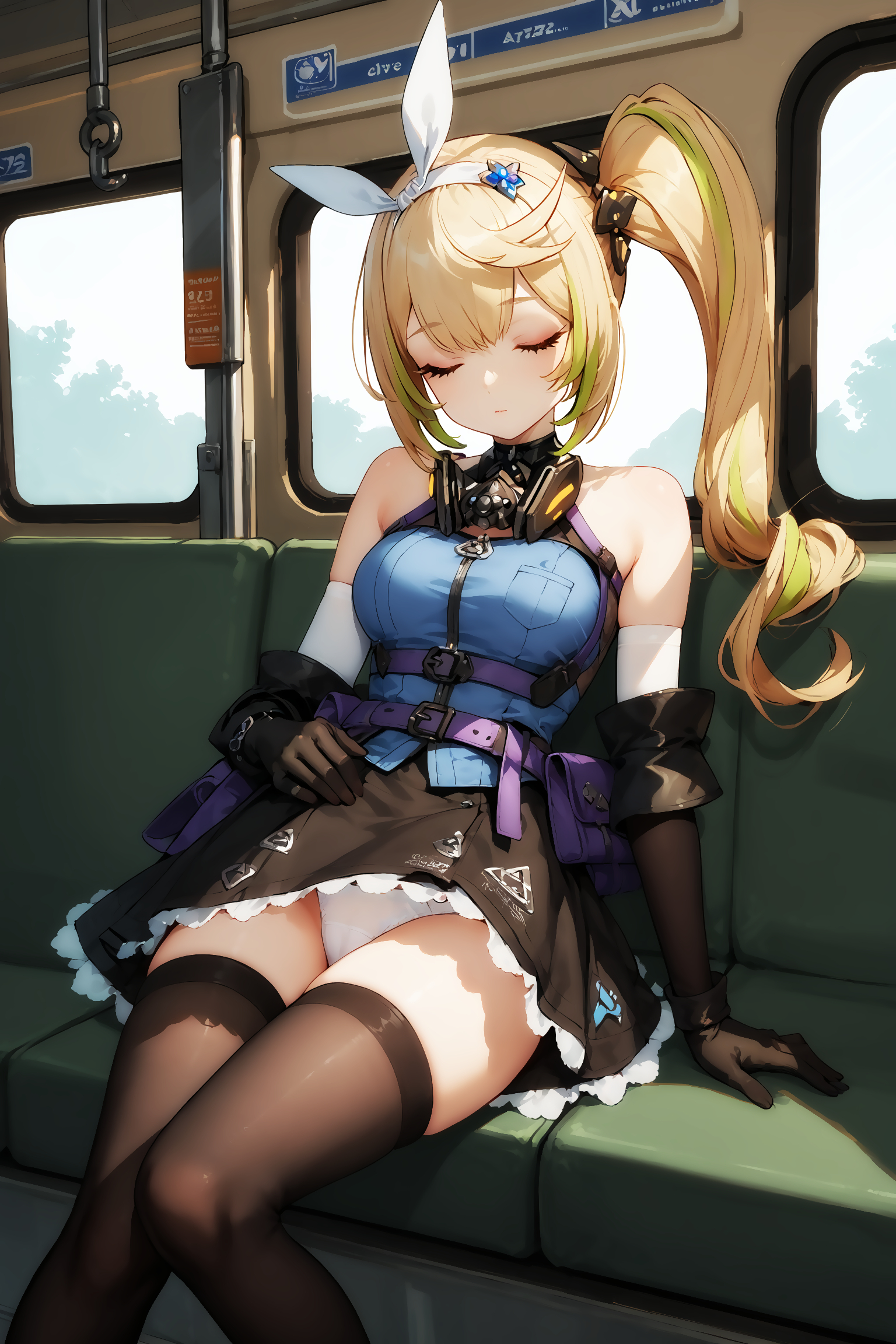 Triggerとプロンプト:SharkryGLF2 - 1girl, multicolored hair, blonde and green hair, side ponytail, green eyes, white hairband