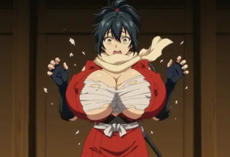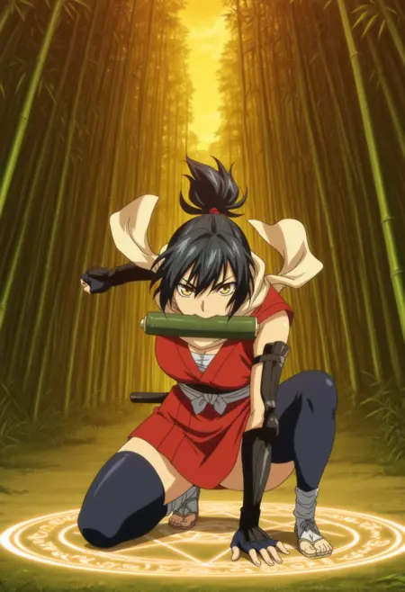 注目タグ:ミディアムヘア、黒髪、黄色い目、ポニーテール、スカーフ、忍者、和服、胸のサラシ、シンハイソックス、ガントレット、フィンガーレスグローブ