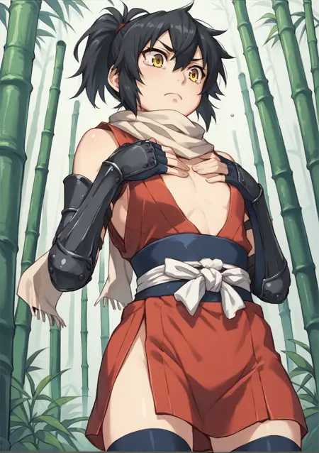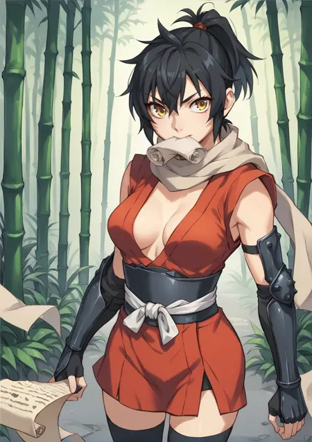 medium hair, black hair, yellow eyes, ponytail, scarf, ninja, japanese clothes, chest sarashi, Thighhighs, gauntlets, fingerless gloves,