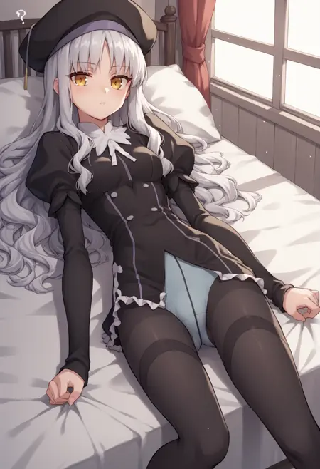 经典形象:长发,灰发,黄眼,贝雷帽,黑色头饰,黑色连衣裙,长袖,蓬松袖子,荷叶边,丝袜,内裤,过膝袜
