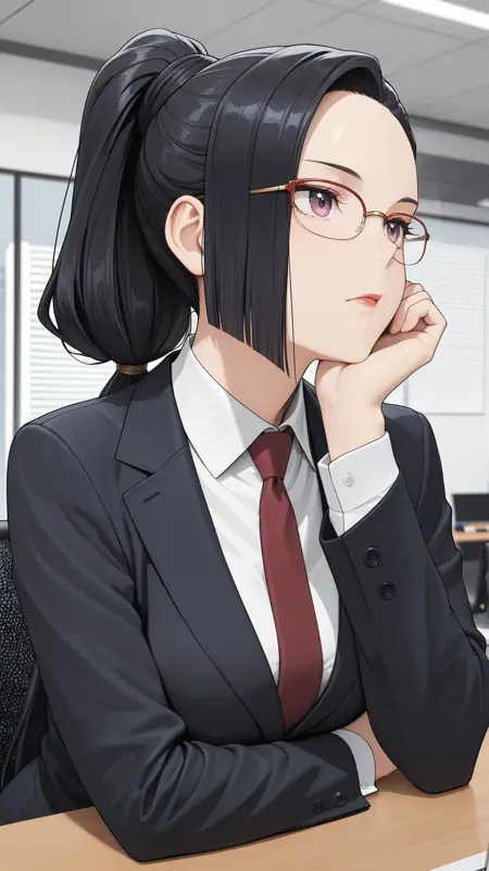 long hair, black hair, high ponytail, side swept hair, blunt ends, low tied hair, purple eyes, red eyeliner, dark blue kimono, light blue obi, high collar, light blue collar, forehead, hairpin,