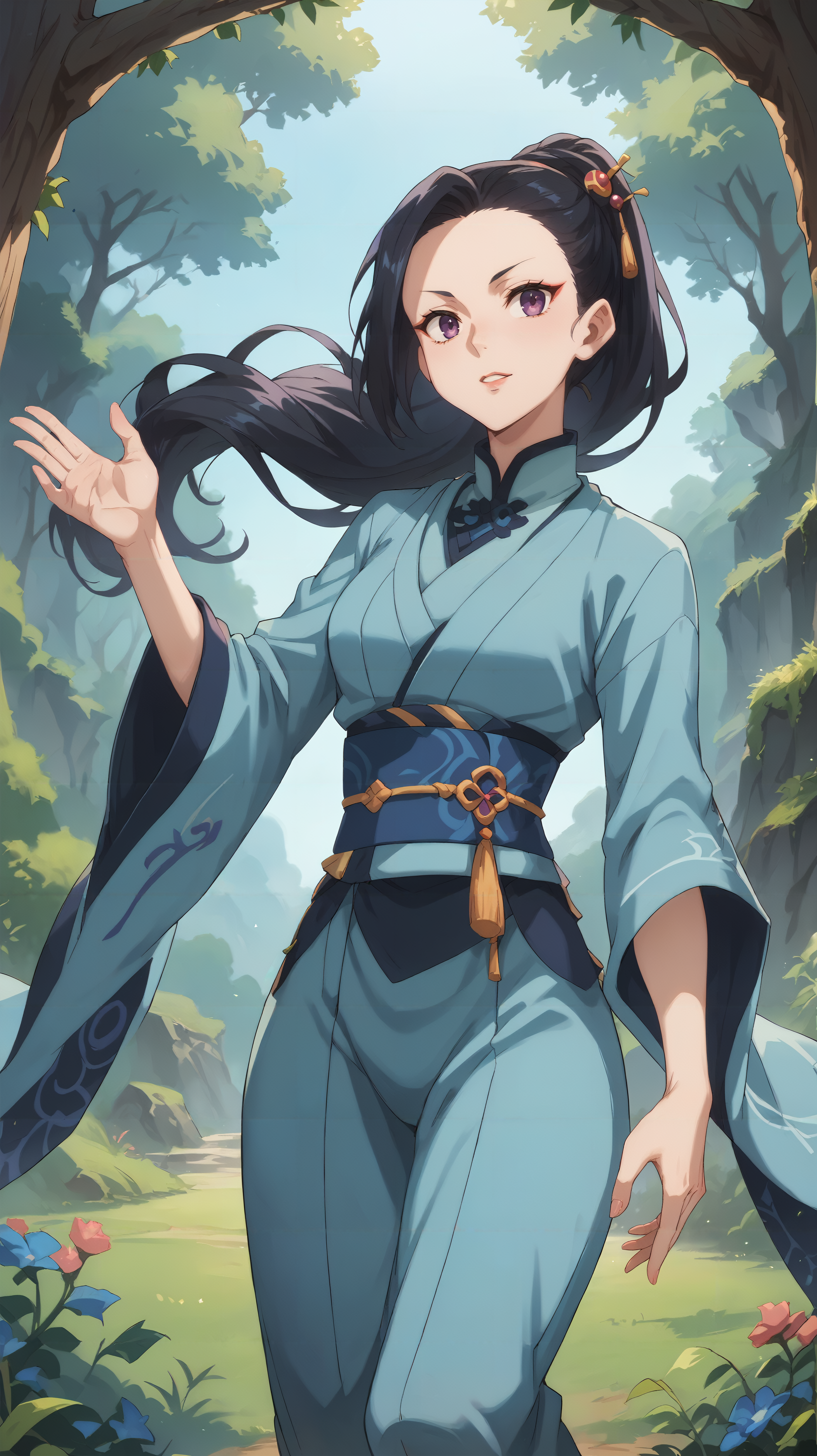 长发,黑发,马尾,发簪,紫色眼睛,蓝色和服,蓝色腰带,