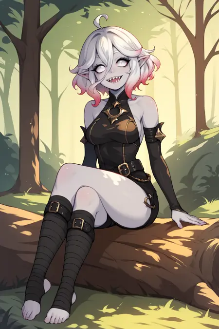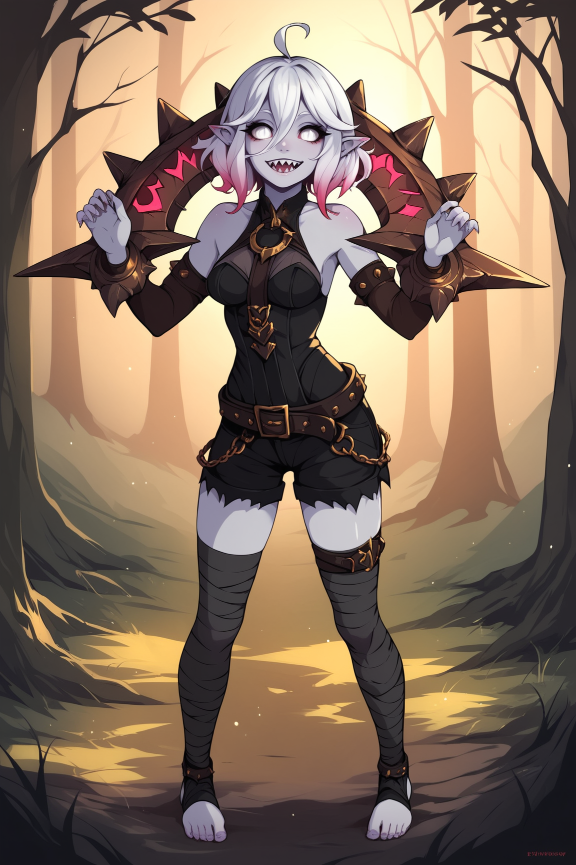 ➜ BriarLoLXLv2, grey skin, colored skin, no pupils, grey eyes, pink sclera, white hair, pink hair, two-tone hair, gradient hair, short hair, hair between eyes, ahoge, pointy ears, sharp teeth, medium breasts, bare shoulders, black thight dress, detached sleeves, black bandaged sleeves, black shorts, belt, (black bandaged legwear), toeless legwear