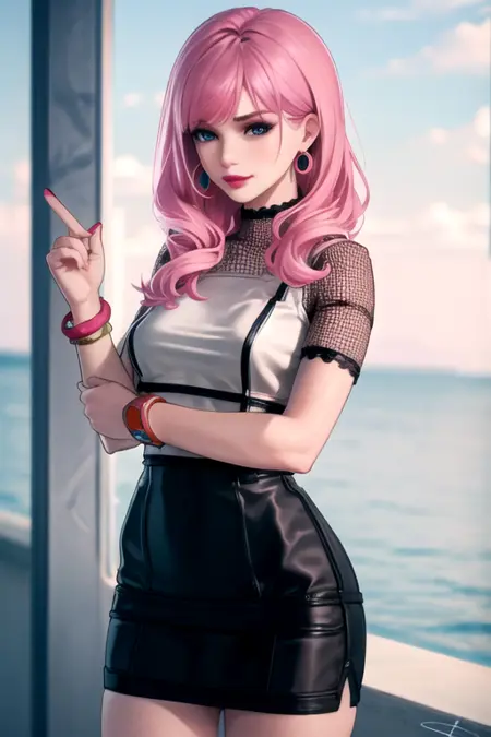 OliveEspinosa, 1girl, solo, long hair, blue eyes, miniskirt, jewelry, pink hair, earrings, black skirt, bracelet, lipstick, fishnets, pencil skirt