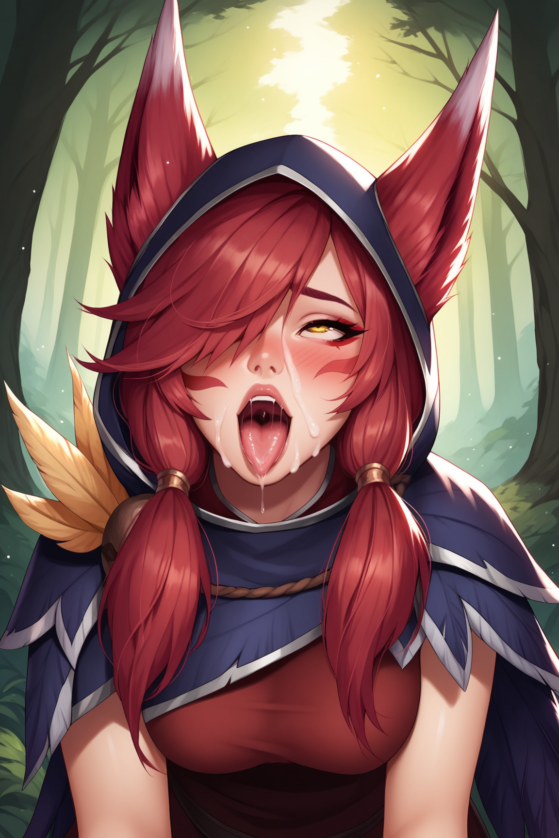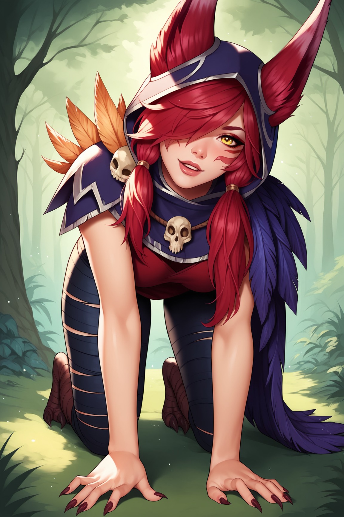 ➜ XayahLoLXL,面部纹饰,黄眼睛,红发,长发,刘海,一缕头发遮住眼睛,动物耳朵,耳朵穿过头饰,中等胸部,兜帽抬起,兜帽,羽毛斗篷,红裙,红裙,护腕,黑色长裤,黑色绷带,怪鸟之足