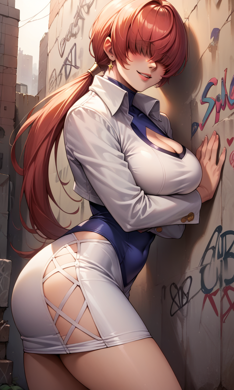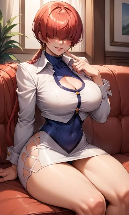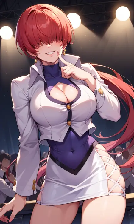 彼女のクラシックスタイルには:SHERMIECLAS, 1 girl, red hair, hair over eyes, split ponytail, clothing cutout, skirt, white jacket, white skirt, leotard, long sleeves