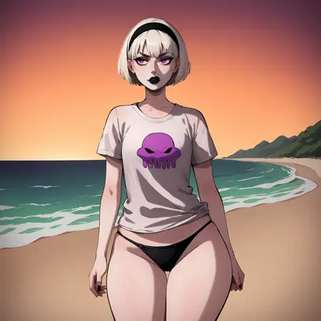 Relevant prompts: shirt print, short hair, bob cut, black hairband, black lips, purple eyes, blonde hair, white hair, white skin, colored skin