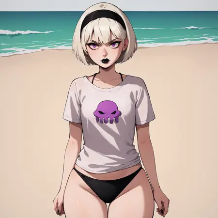関連プロンプト:シャツのプリント、ショートヘア、ボブカット、黒いヘアバンド、黒い唇、紫の目、金髪、白髪、白い肌、色付きの肌