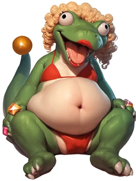 The most hilarious boss in a Nintendo franchise videogame (Wario World), Dinomighty a dinosaur wearing a red bikini with a bloated belly and bulged out eyes.
