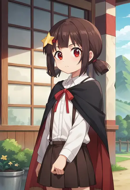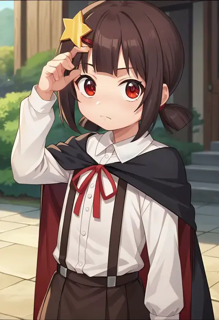 의상: 어깨끈 치마, 드레스 셔츠, 망토, 긴 소매, 빨간 리본,