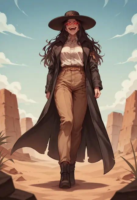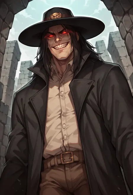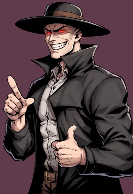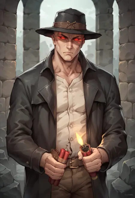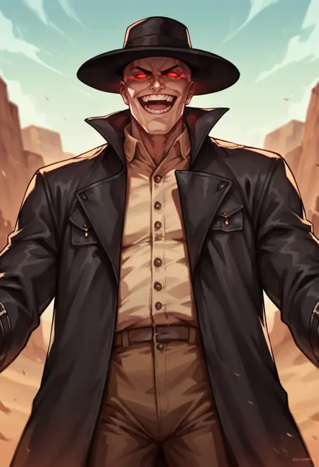 score_9, score_8_up, score_7_up, score_6_up, score_5_up, score_4_up, 1boy, lora:Caleb:0.85 单人, 肌肉男性, 帽子, 宽边帽, 红色眼睛, 发光眼睛, 风衣, 黑色外套, 无发, 暗色面部, 阴影面部,