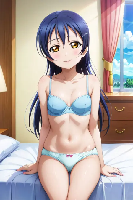 トリガーワード:1girl、umi、青い髪、黄色い目、小さな胸、長い髪