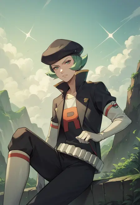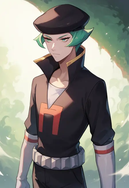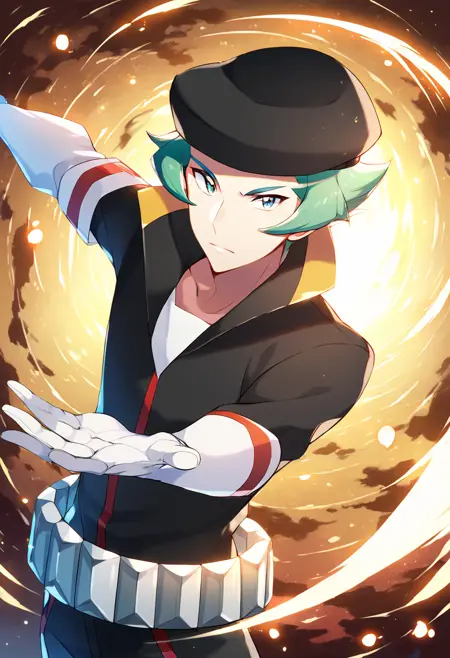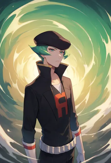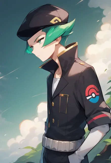 proton_pokemon, green hair, green eyes, black hat, black jacket, black pants, white gloves, white boots, white belt