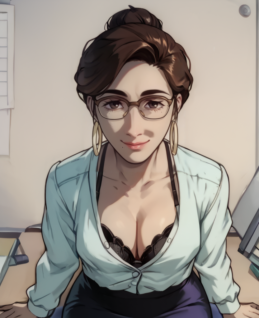 hoop earrings, whit shirt, long sleeves, cleavage, blue pencil skirt, necklace,