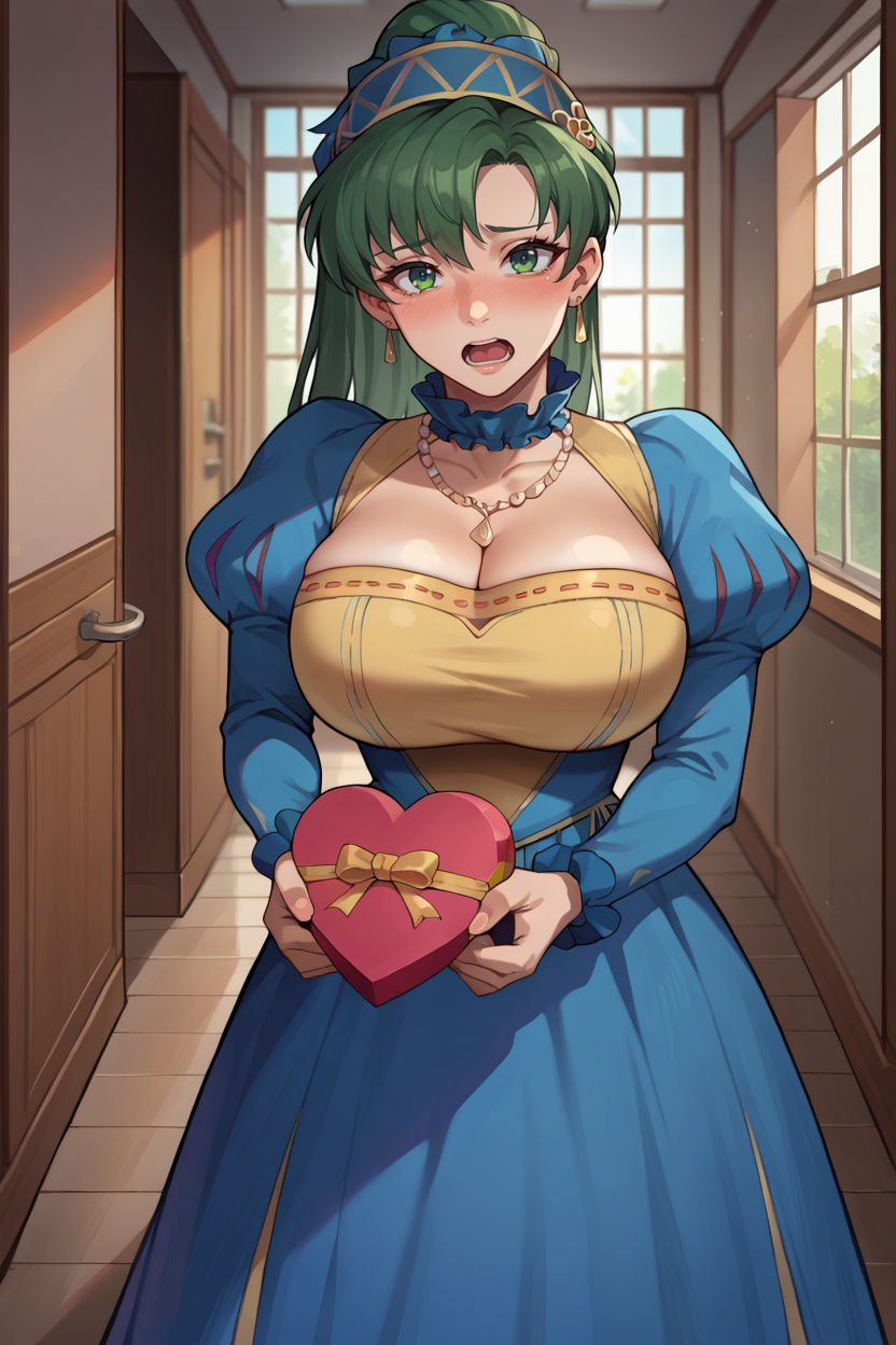 Valentine's Lynには、「valLyn, green hair, high ponytail, hairband, earrings, frilled choker, necklace, cleavage cutout, blue ballgown, puffy sleeves, long sleeves」を追加してください。