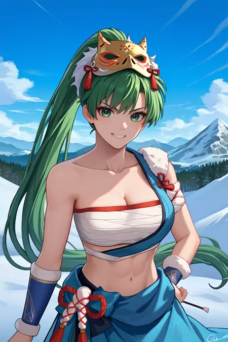 Flame Lynには、「flmLyn, green hair, high ponytail, mask on head, collarbone, single bare shoulder, single sleeve, white bandeau, cleavage, wrist wrap, white rope, blue skirt, bracers」を追加してください。