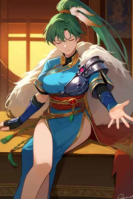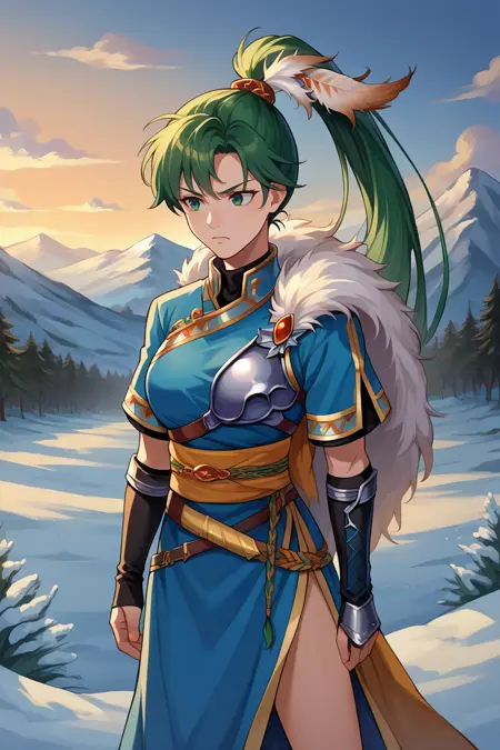 Legendary Lynには、「lgdLyn, green hair, high ponytail, feather hair ornament, armor, blue dress, short sleeves, white feather boa, sash, side slit, gauntlets」を追加してください。