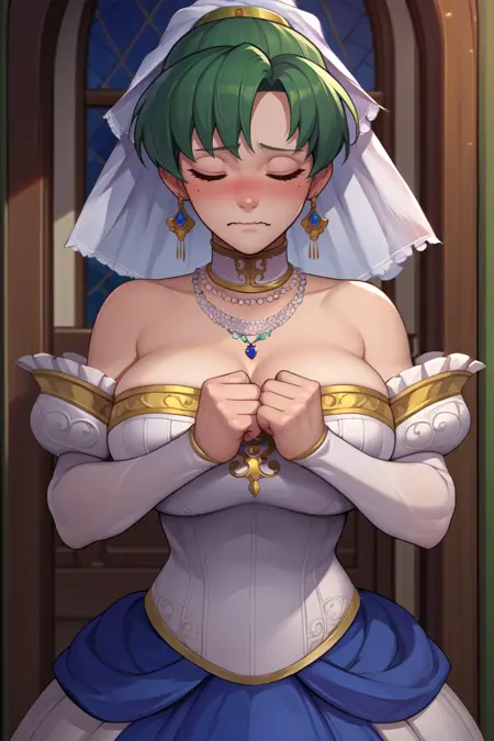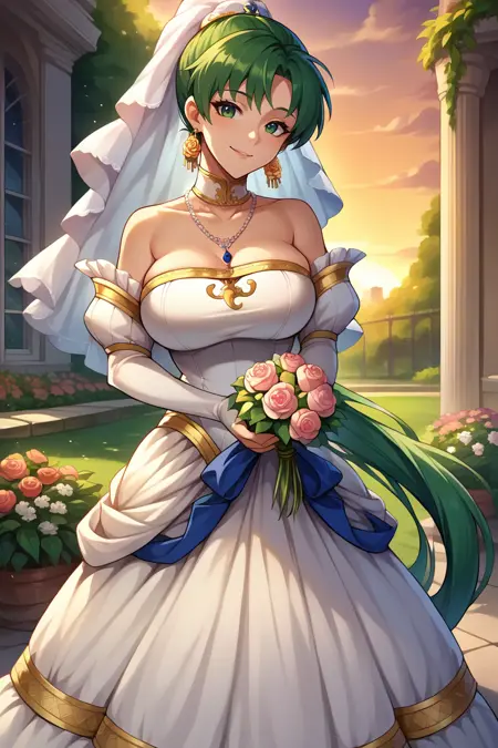 Bride Lynには、「brideLyn, green hair, high ponytail, bridal veil, white choker, necklace, earrings, wedding dress, off-shoulder, elbow gloves」を追加してください。