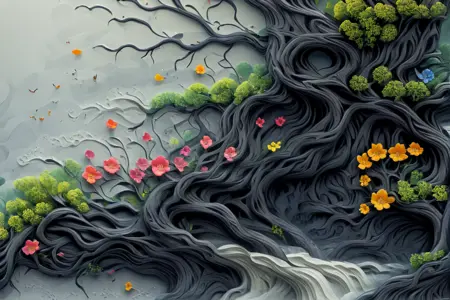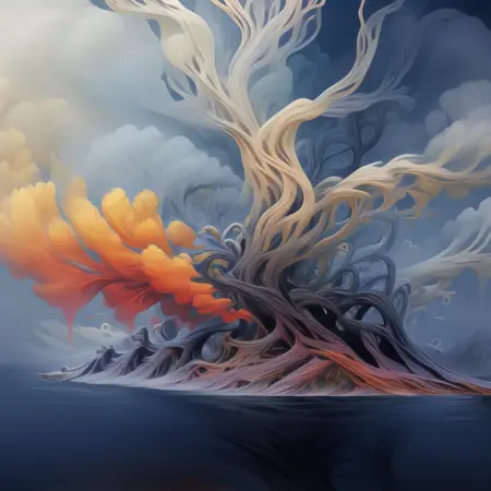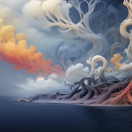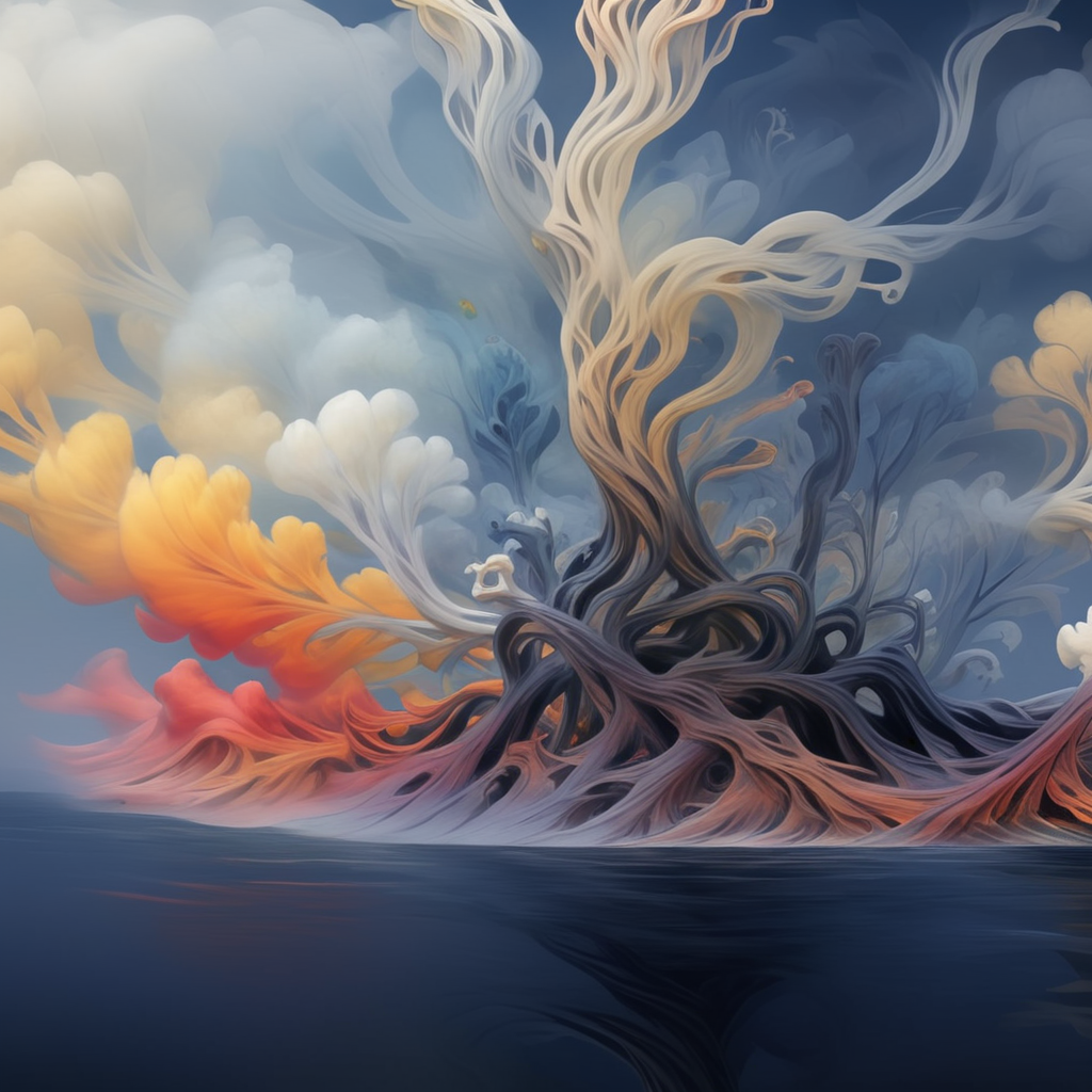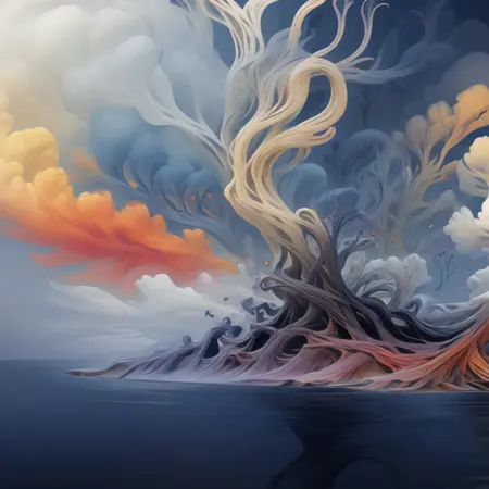 关键词:根、树、无人、枝条、叶子、云、天空、水、岛