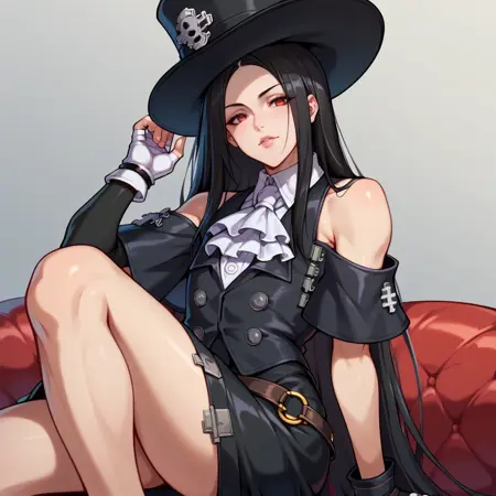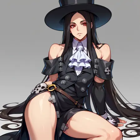 服装:正式,黑色袖子,可拆卸袖子,领结,高顶礼帽,黑色长裙,侧开衩,无指手套,裸露肩膀,不对称手套
