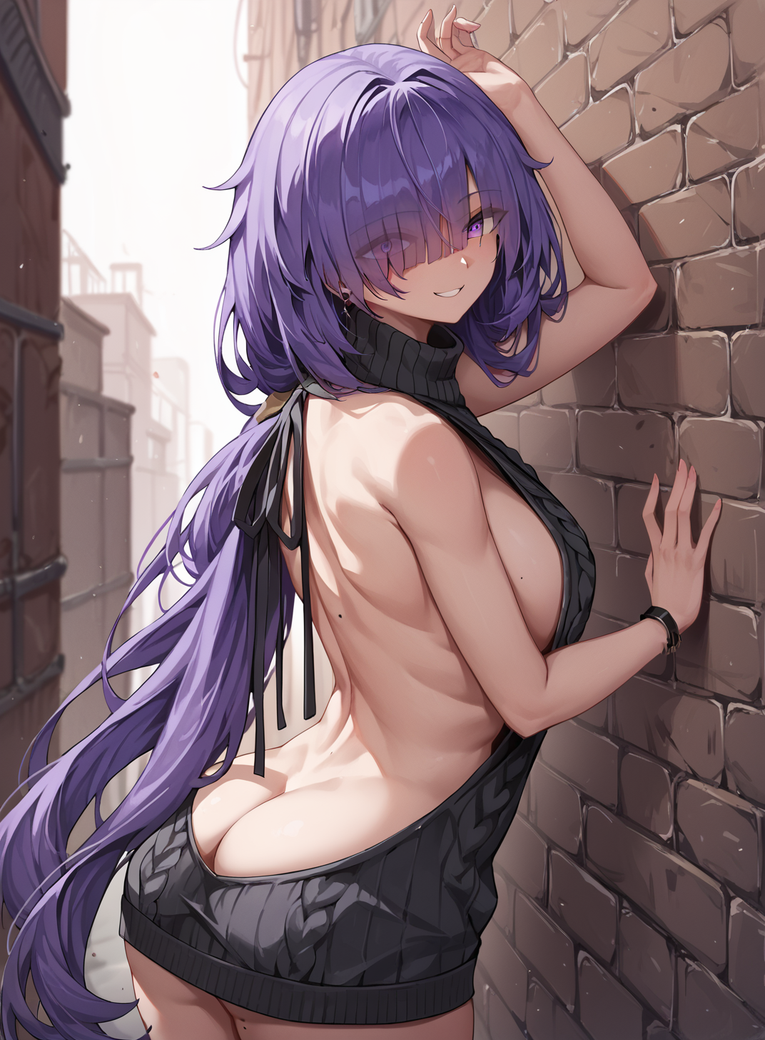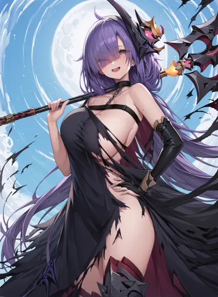 原版(origen): mogador \(azur lane\), 发丝遮住一只眼睛, 紫色头发, 眼睛透过头发可见, 雀斑, 长发, 头饰, 黑色连衣裙, 胸带, 破损衣物, 肘部手套, 小腿护甲, 领圈,