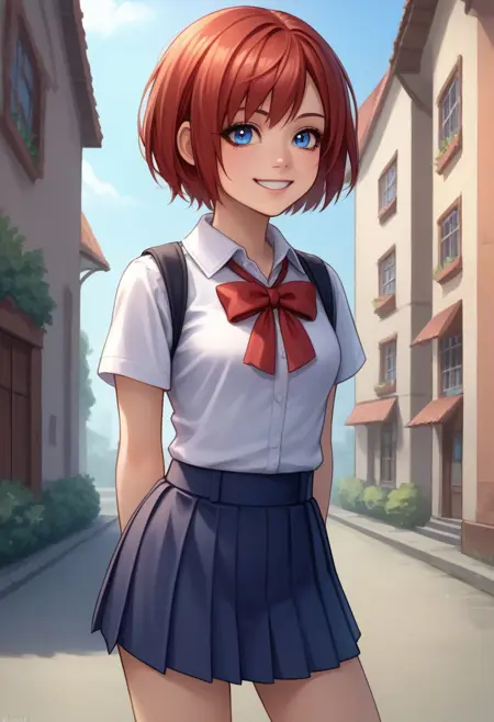 kairkh, 1girl, solo, blue eyes, red hair, medium hair, hair between eyes, school uniform, shirt, white shirt, collared shirt, necktie, blue necktie, plaid necktie, skirt, blue skirt, plaid skirt, socks, black socks, loafers,