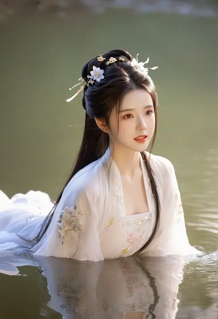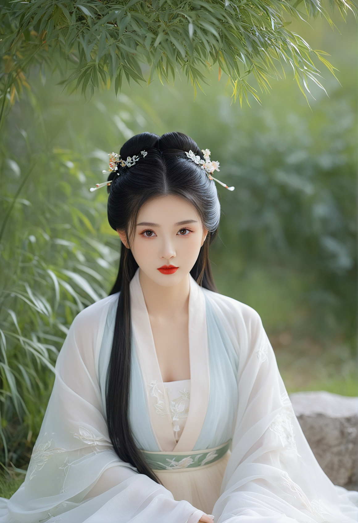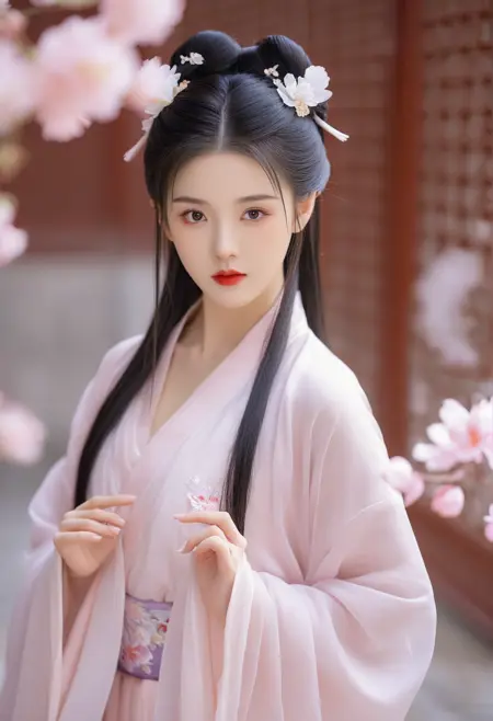 如需绘制汉服,必须加这一段完整的词组,不然没效果: hanfu,wide sleeves,long sleeves,sleeves past fingers,see-through,hair stick,hair ornament,