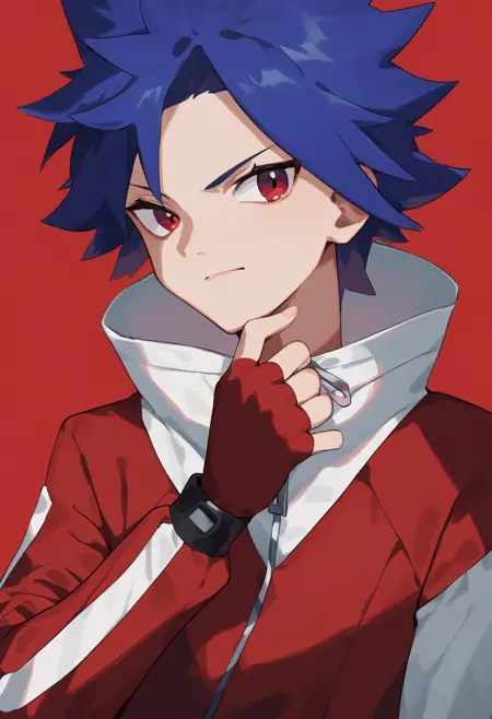 hugh_pokemon, blue hair, red eyes, multicolored jacket, red jacket, blue pants, blue leggins, red shoes, fingerless gloves, zipper pull tab,