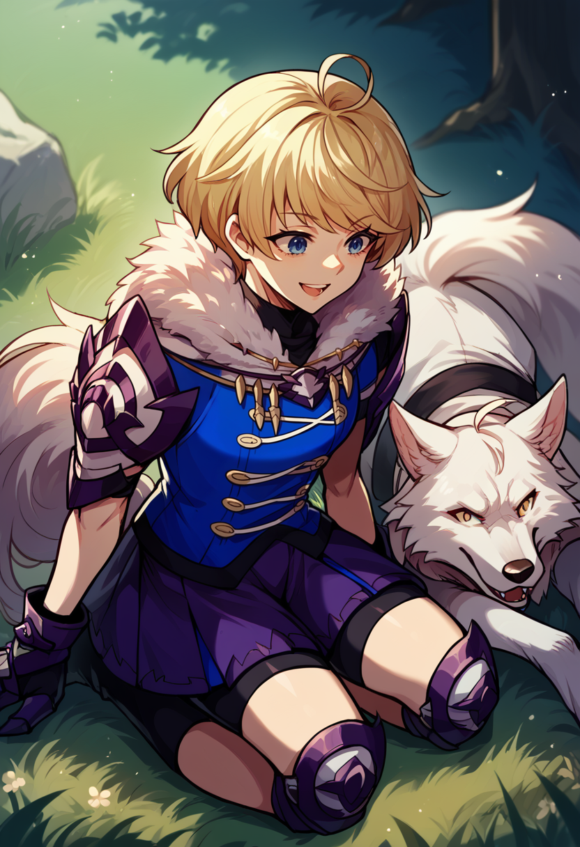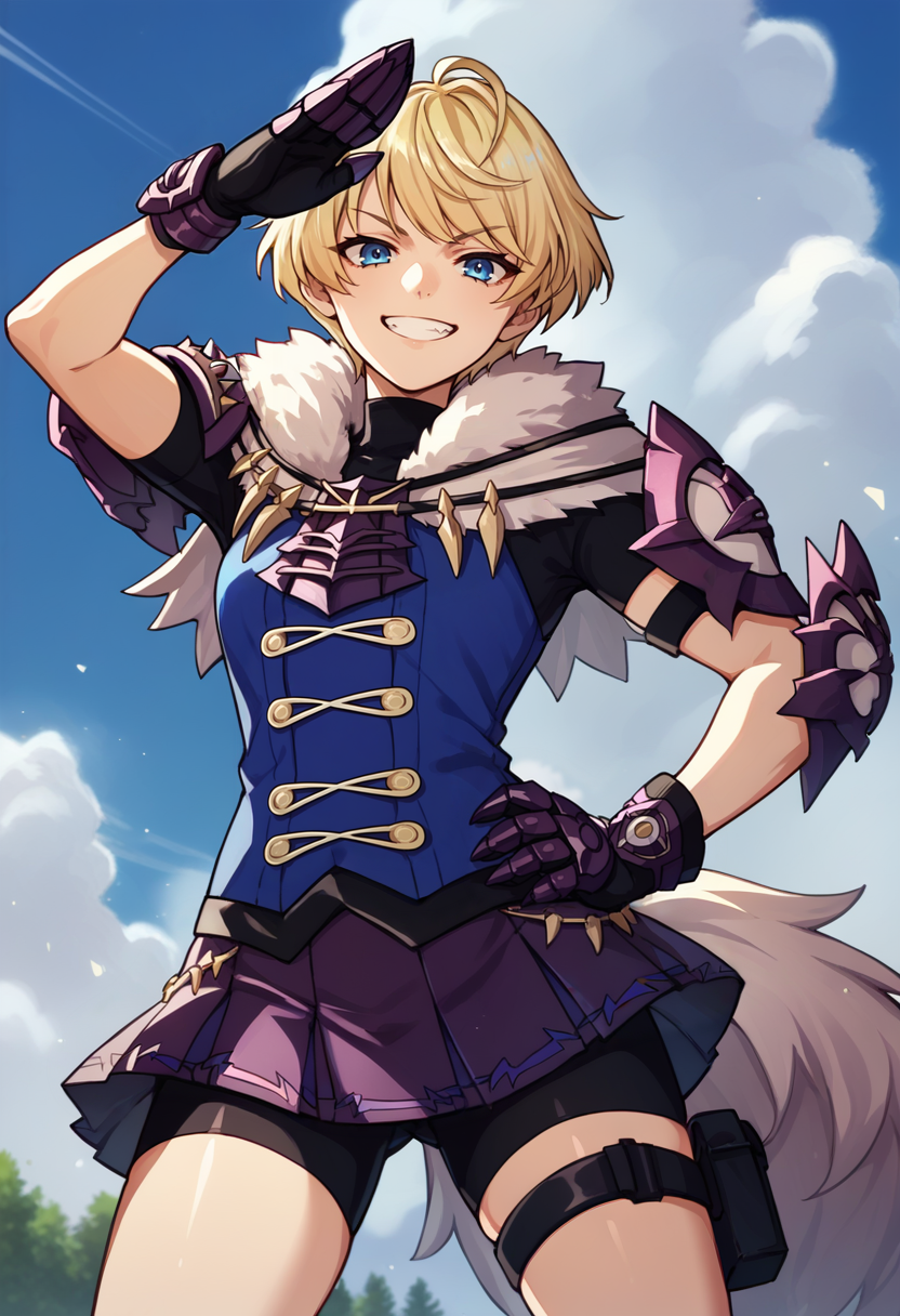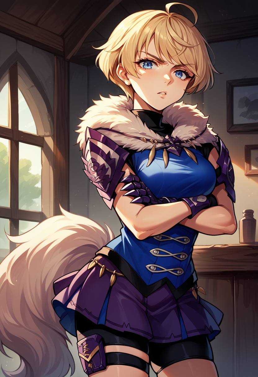 默认外观: defMerrin,短发,天线辫,蓝色衬衫,毛皮领,高领,短袖,肘部护垫,护腕,紫色短裙,褶皱裙,骑行短裤,狼尾,黑色大腿绑带,膝盖护垫,装甲靴