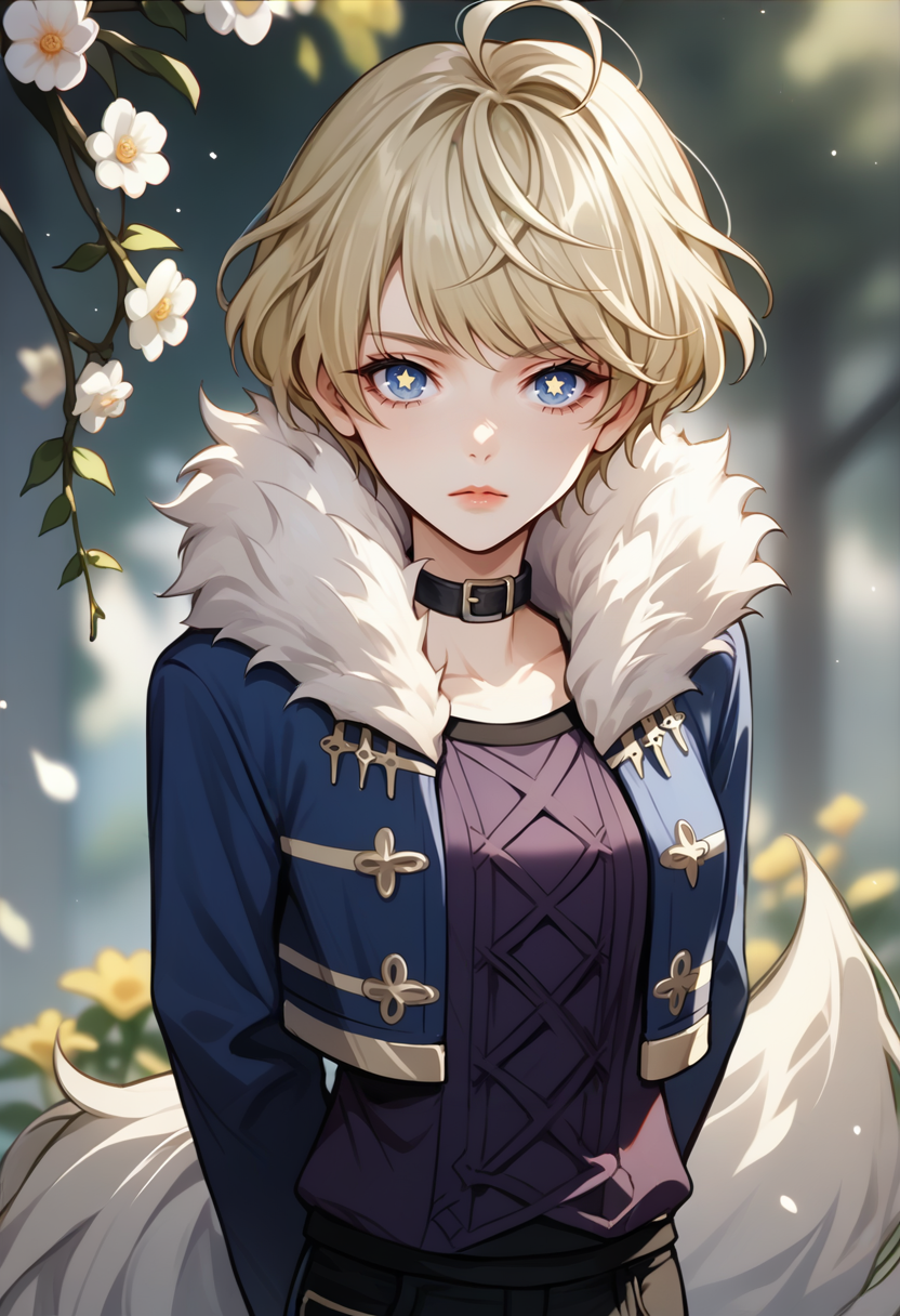 Somniel 外观: casMerrin,短发,天线辫,黑色项圈,毛皮镶边夹克,短款夹克,长袖,紫色衬衫,黑色长裤,黑色长靴,狼尾