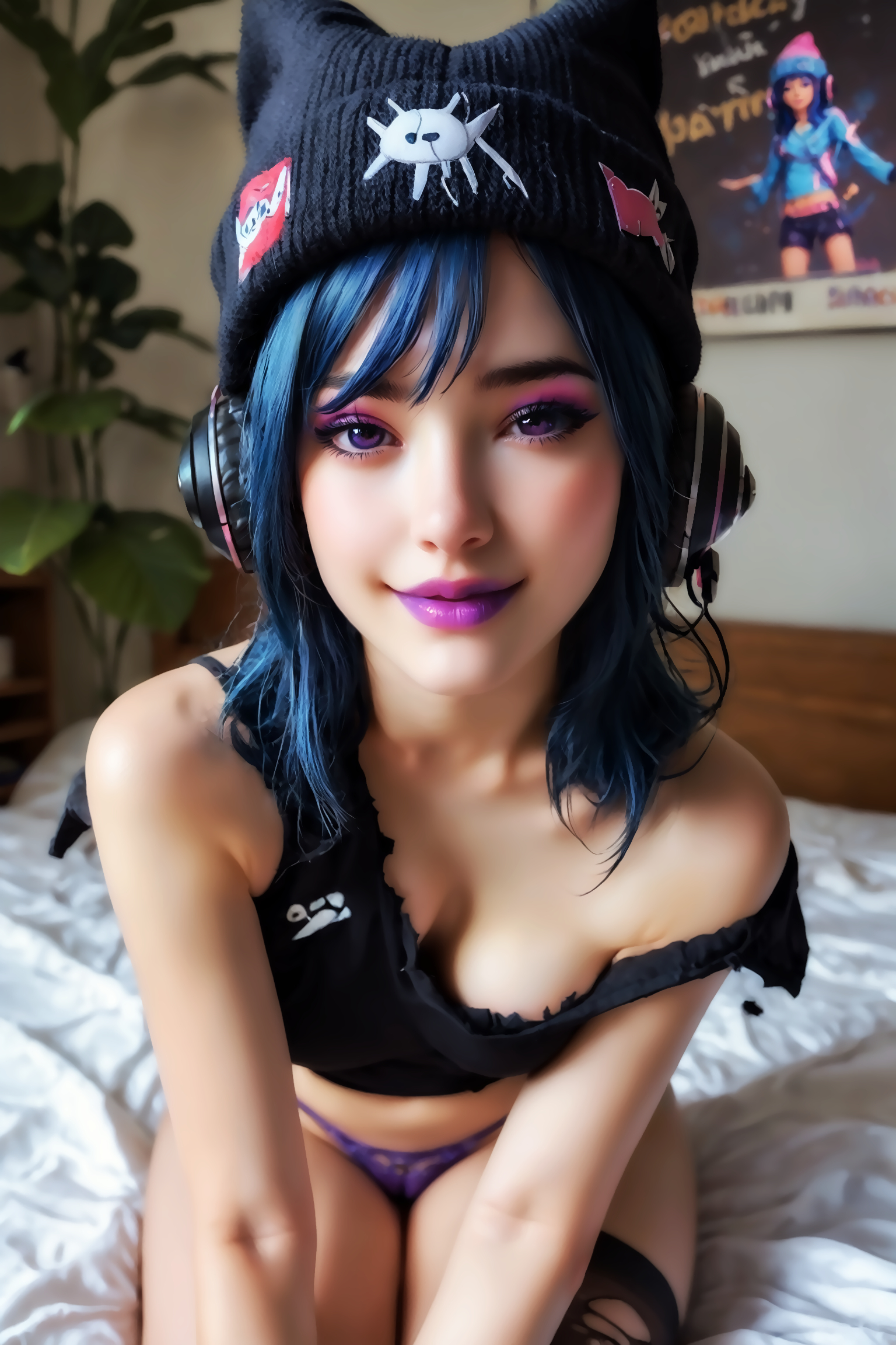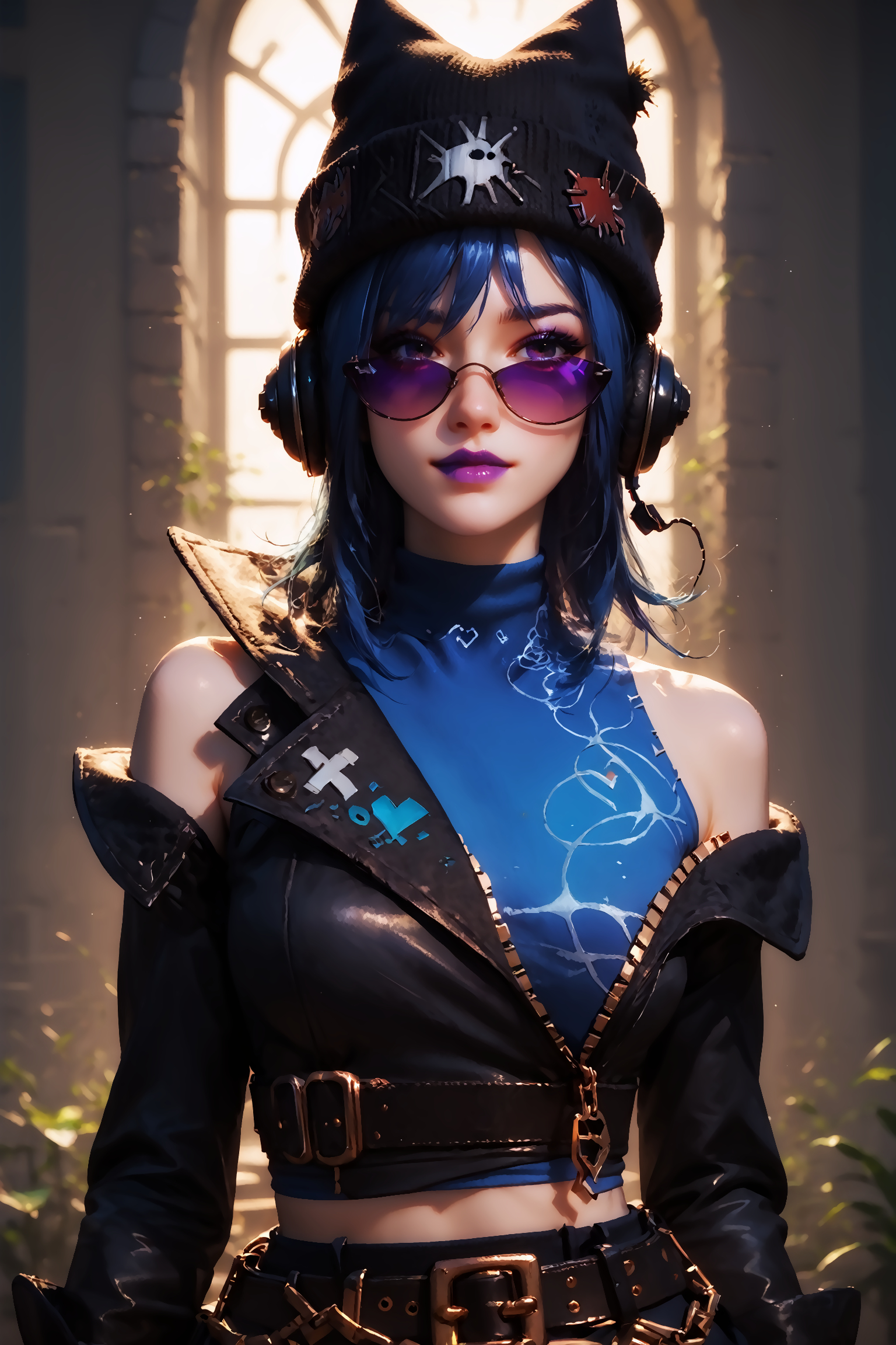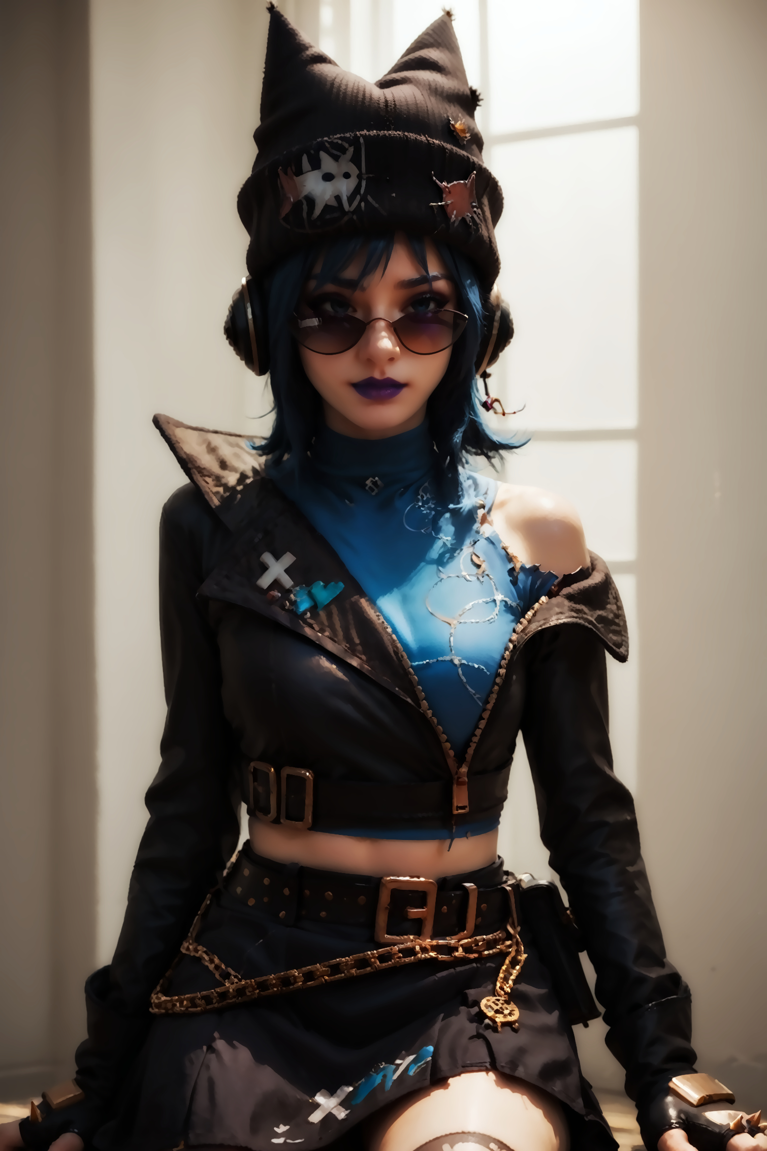 触发词与提示词:HopeFortnite - 1girl, 黑裙, 腰带, 墨镜, 针织帽, 蓝发, 紫唇, 不对称长筒袜, 撕裂长筒袜, 鱼网长筒袜, 黑色头饰, 耳机。