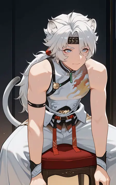 Prompt: linyang, white hair, long hair, blue eyes, headband, facial mark, hair between eyes, low ponytail, parted bangs, white tiger ears, white tiger tail, hair accessory