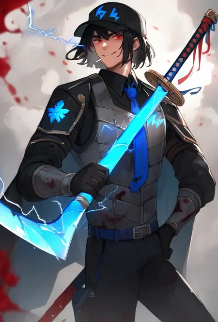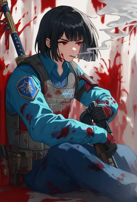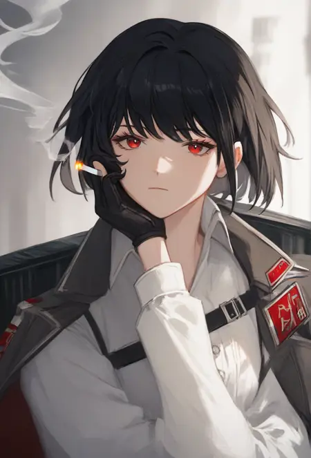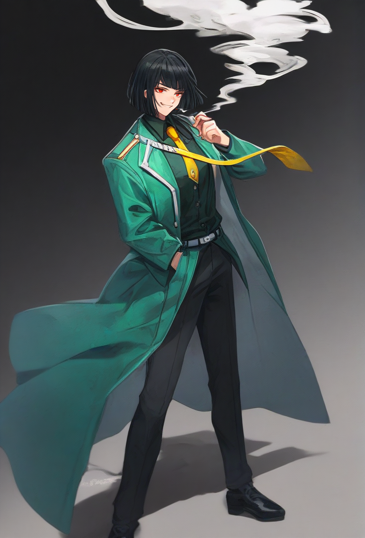 RyoshuSinner,黑色鞋履,黑色夹克,夹克搭在肩上,黑色长裤,白色衬衫, katana,香烟