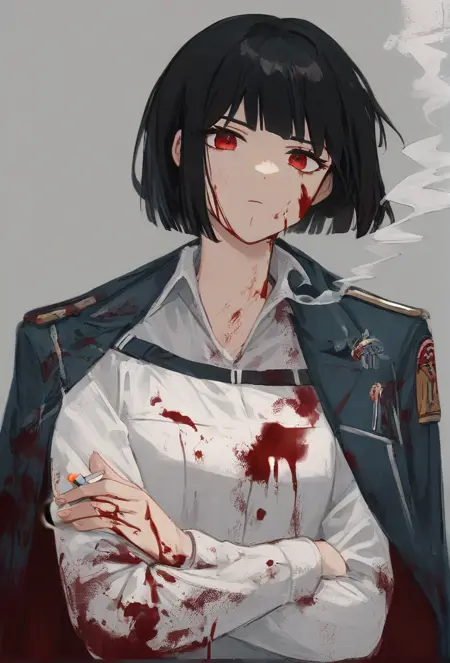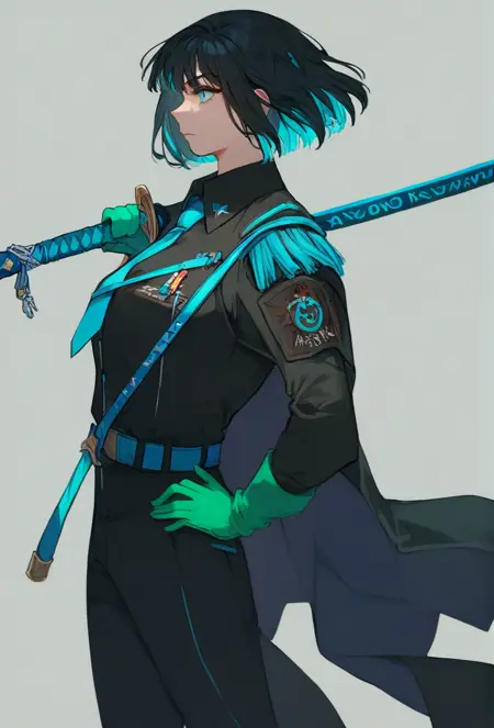 RyoshuBlindObs,双色头发,多色头发,黑色头发,浅蓝色头发,浅蓝色眼睛,黑色领带,军装,黑色背心,浅蓝色衬衫,黑色长裤,浅蓝色肩带