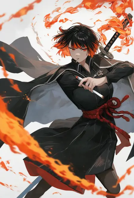 RyoshuFlame,火焰,灰烬,双色头发,多色头发,黑色头发,红色头发,和服,黑色礼服,黑色斗篷