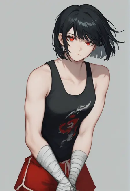 RyoshuLiu,黑色背心,绑带双手,黑色鞋履,黑色长裤,红色夹克