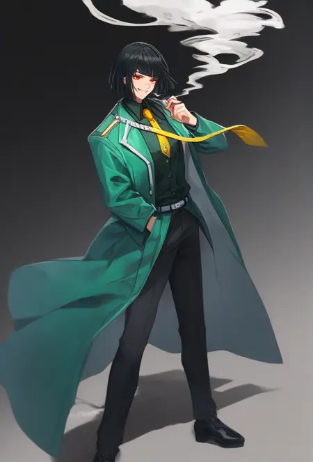 RyoshuNcorp,长发,高马尾,红色镜片矩形眼镜,黑色衬衫,红色领带,黑色背心,黄色外套,敞开式外套,黑色长裤,黑色爪形手套,黑色鞋履