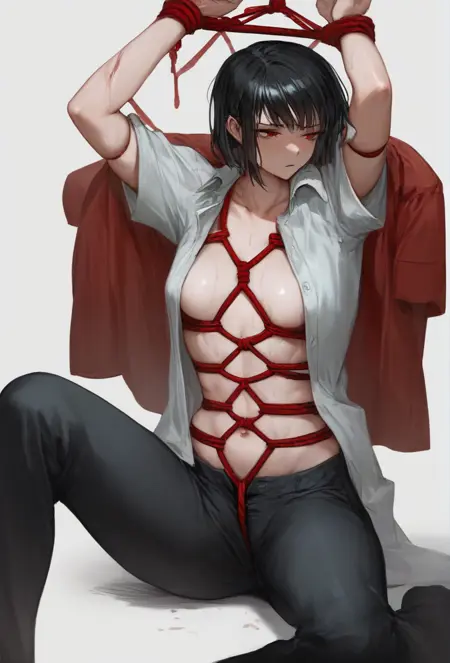 RyoshuThoracalgia,白色约束衣,绑住双手,眼罩,黑色长裤,黑色鞋履,金属束缚