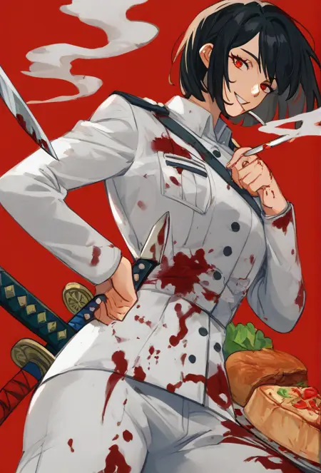 RyoshuChef,刀具,白色衬衫,胸前口袋,白色长裤,白色鞋履,衣物上有血迹