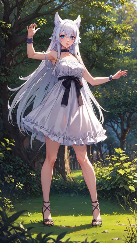 white hair, long hair, animal ears, blue eyes, white dress, bracelets, bare shoulders, blue ribbon, choker, gladiator sandals