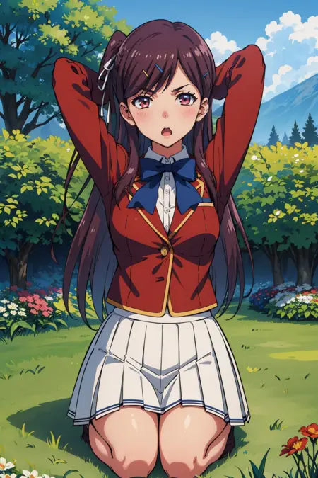 彼女の典型的な外見には、「ヘアクリップ、赤いブレザー、青いネクタイ、長袖、プリーツスカート、白いスカート」を追加してください。