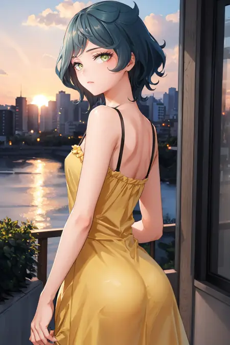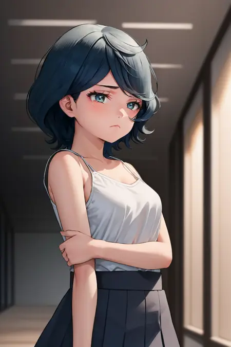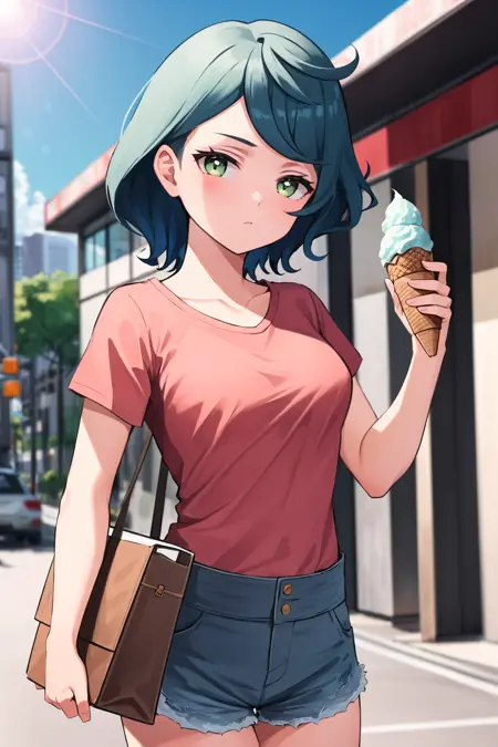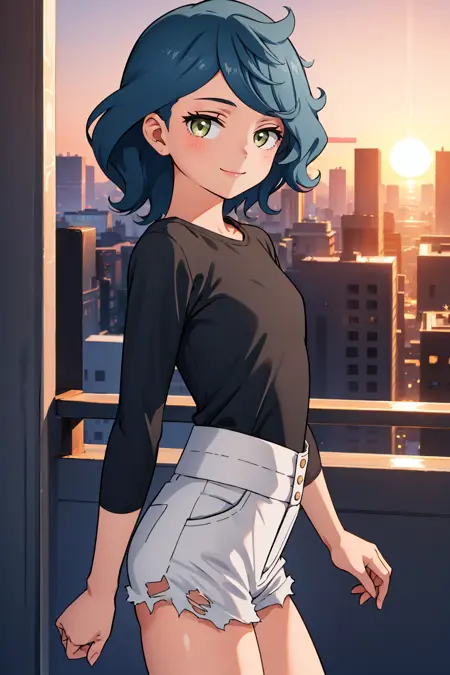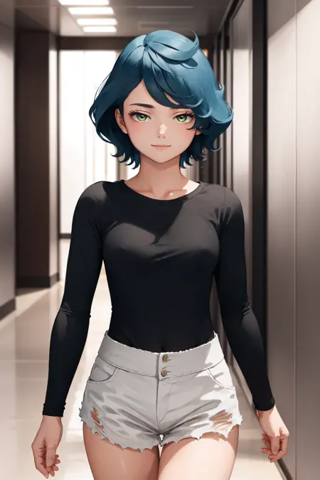 캐주얼 복장을 원하면 "검은 셔츠, 긴 소매, 흰색 반바지, 찢어진 반바지"를 추가하세요.