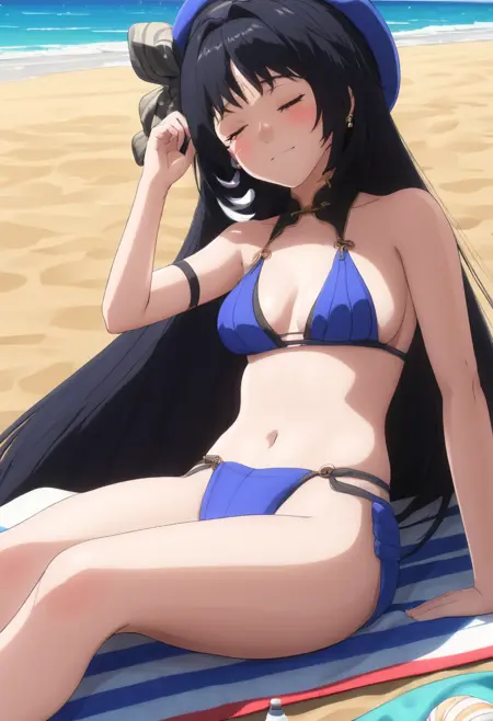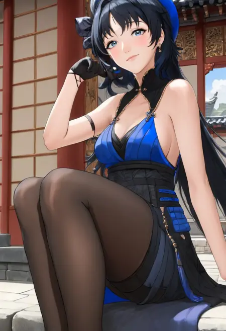 官方服装触发词:无袖蓝色连衣裙,手套,贝雷帽,黑色连裤袜,裹胸布,