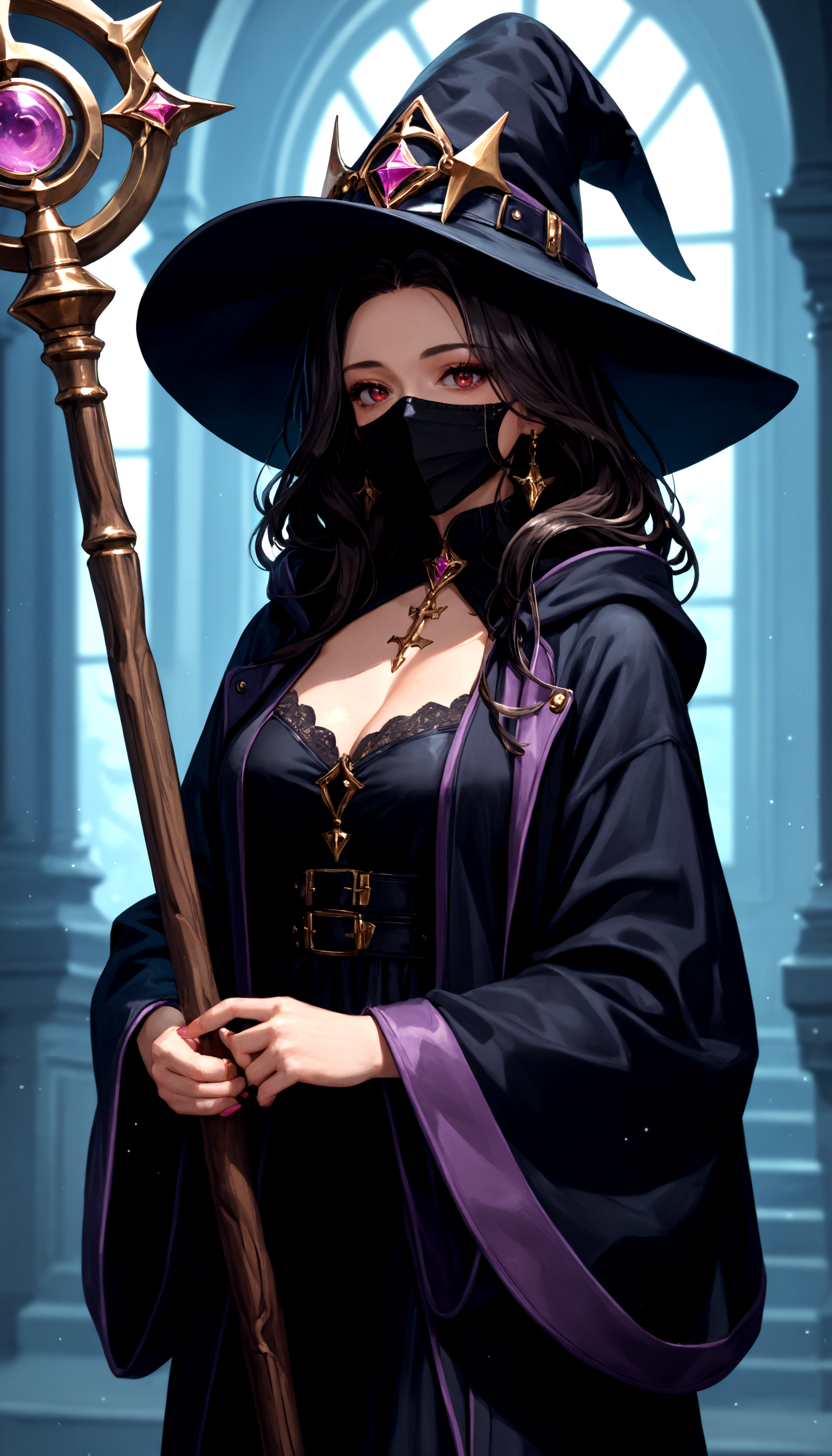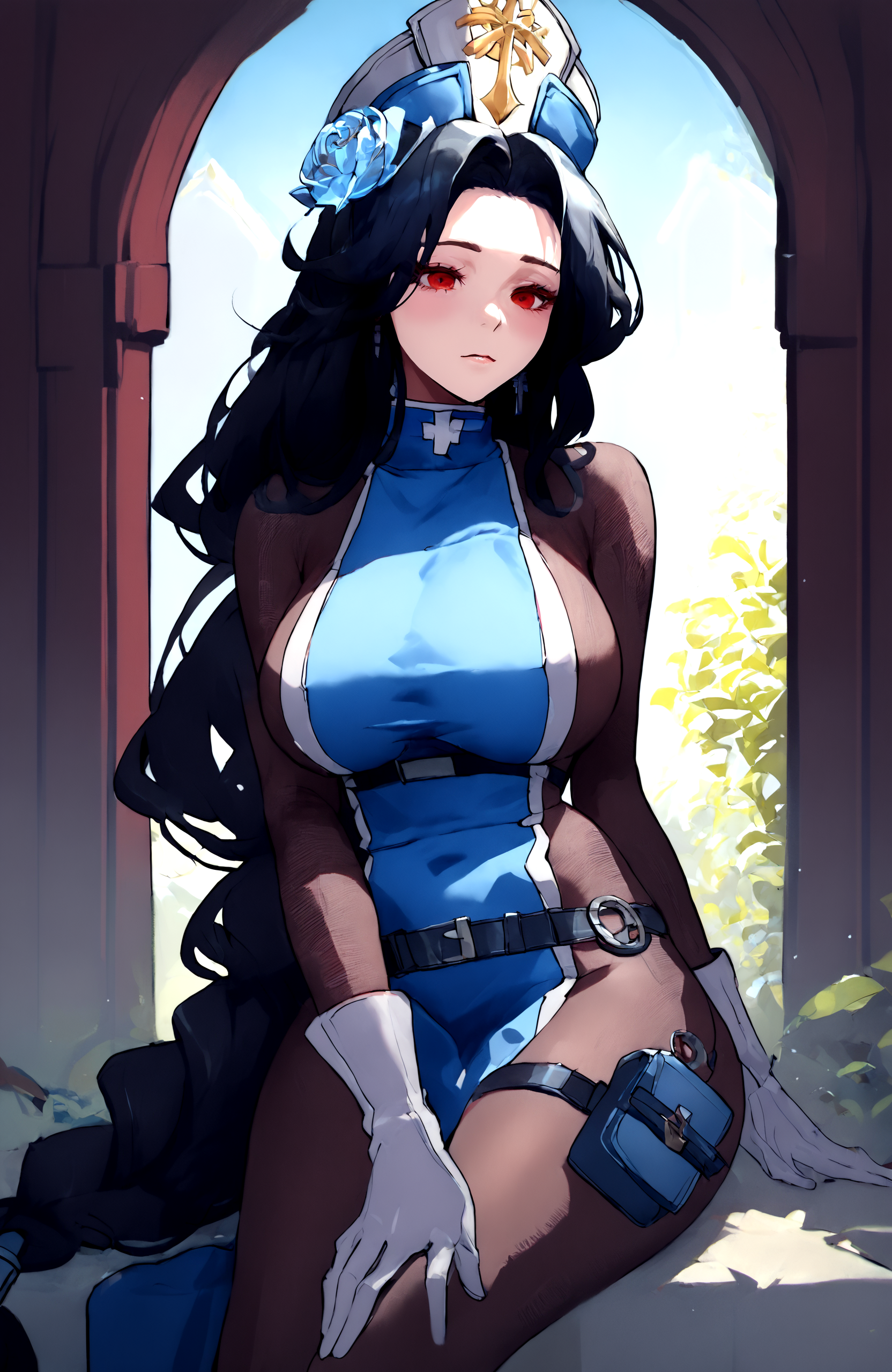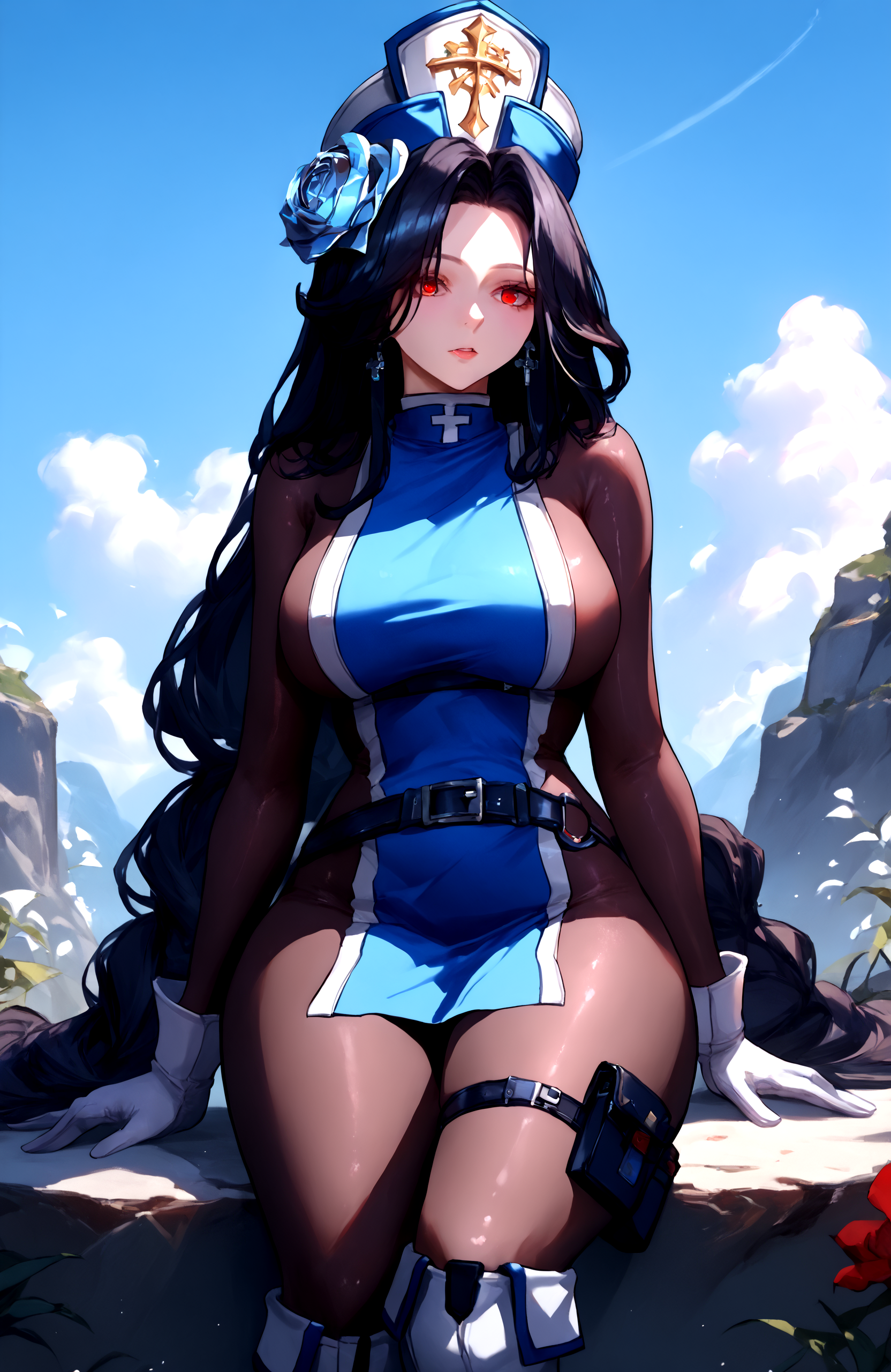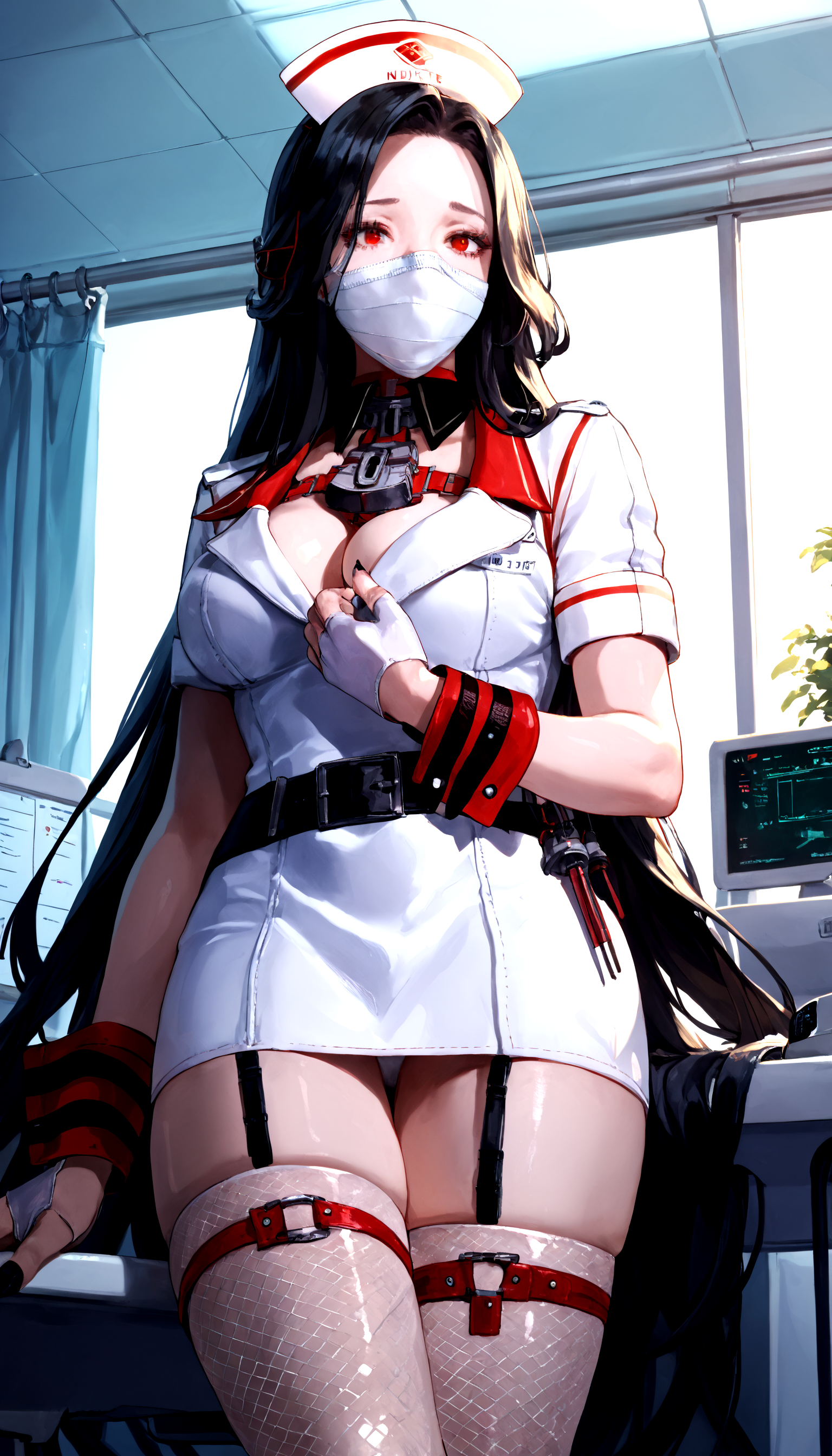 간호사: maiden_nikke, solo, black_hair, nurse_outfit, mask, fingerless_gloves, cleavage, nurse_cap, belt,
