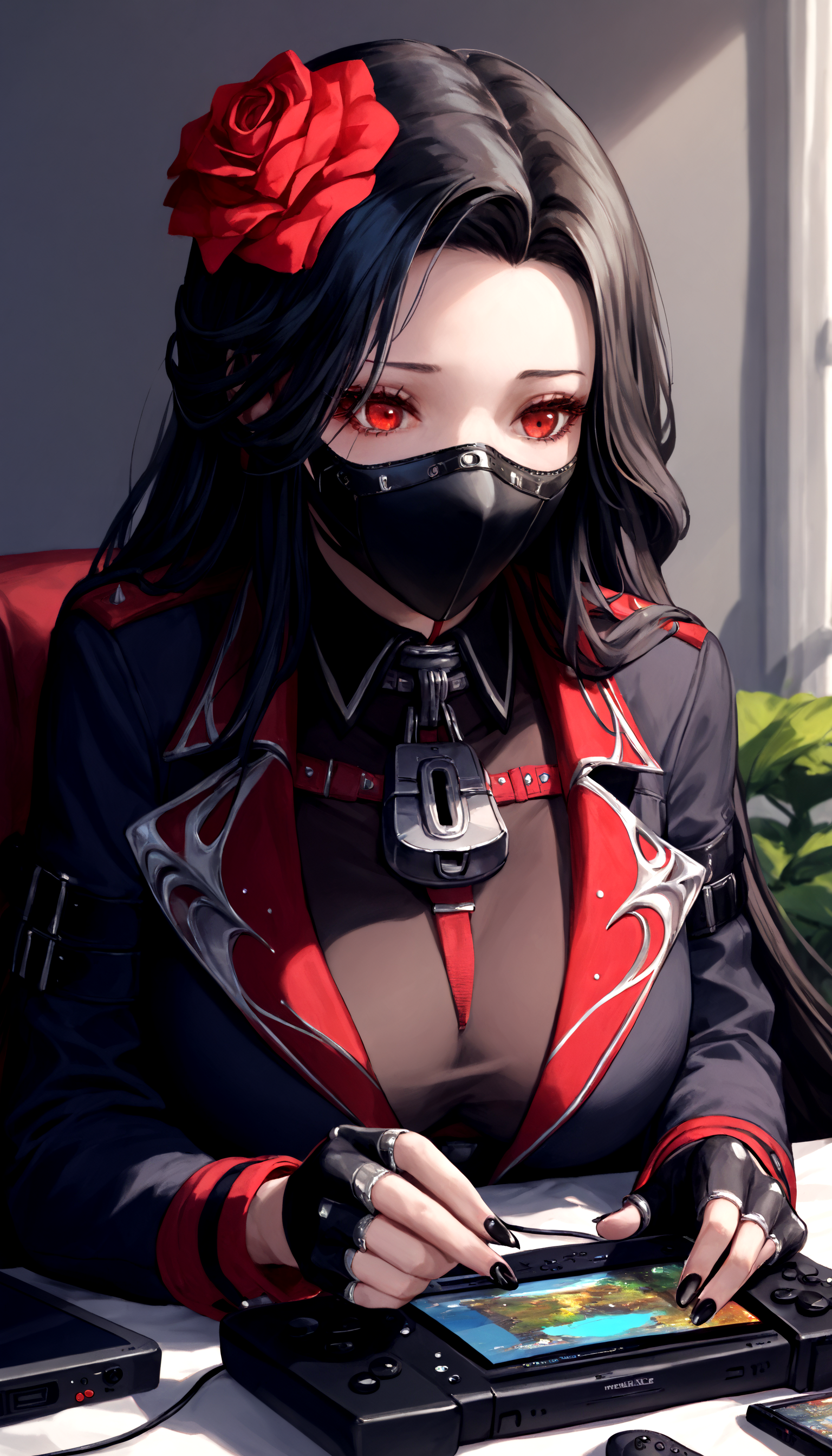 디폴트: maiden_nikke, red_eyes, black_hair, large_breasts, fingerless_gloves, cleavage, std_outfit, mouth_mask, hair_flower