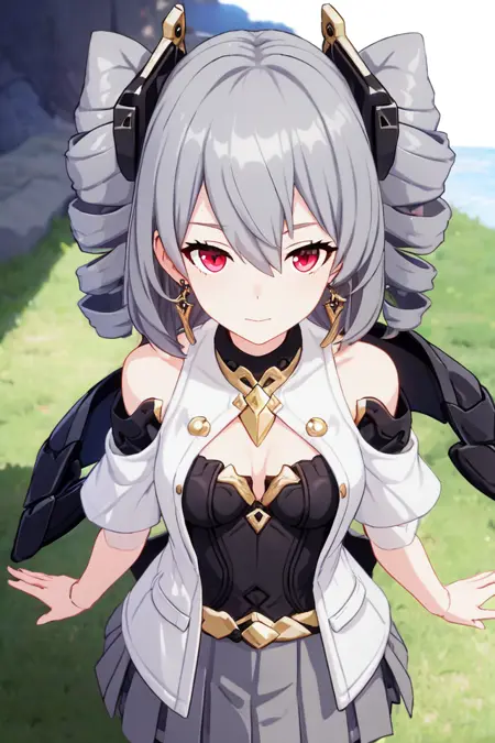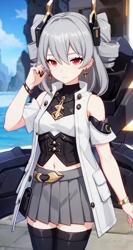提示词: ph_Prometheus, Prometheusds, 1girl, solo, bangs, jewelry, earrings, drill hair, twin drills, grey hair, closed mouth, red eyes, hair between eyes, skirt, bare shoulders, grey skirt, hair ornament, jacket, pleated skirt, short sleeves, long hair, shirt, vest, small breasts, belt, black shirt, breasts, open clothes, white jacket, medium hair