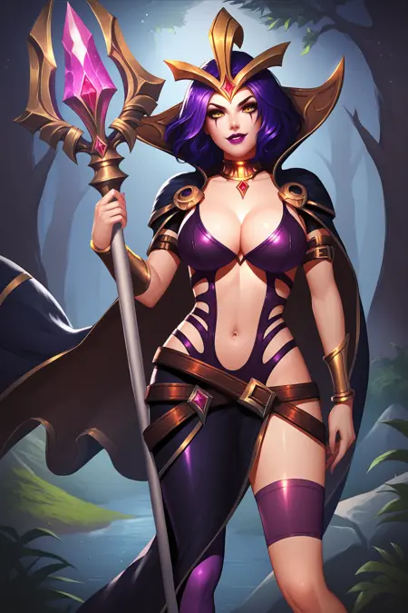 ➜ LeblancLoLXL, league of legends, facial mark, makeup, purple lips, yellow eyes, dark purple hair, short hair, tiara, forehead jewel, red jewel, large breasts, black cape, pauldrons, neck ring, cleavage, bodysuit, bracelet, navel, black skirt, belt, purple thighhighs, single thighhigh, gold high heels, holding staff, staff with jewel