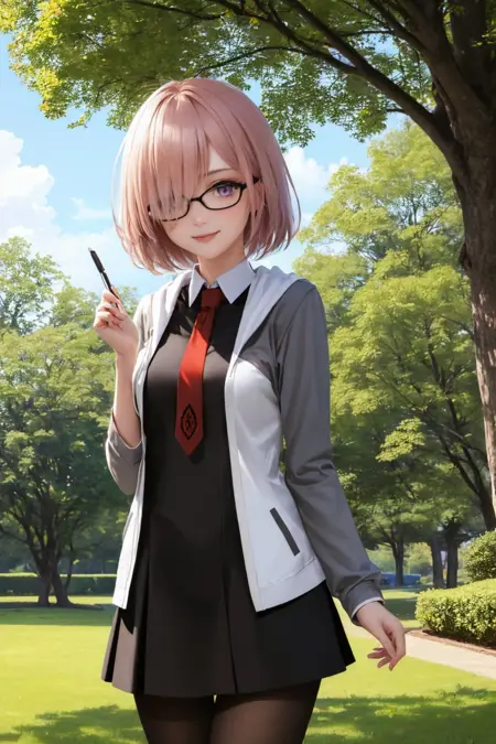 기본 의상: kyriedef, 한쪽 눈 위로 머리카락을 두르고, 안경, 자켓, 검은 드레스, 빨간 넥타이, 팬티스타킹