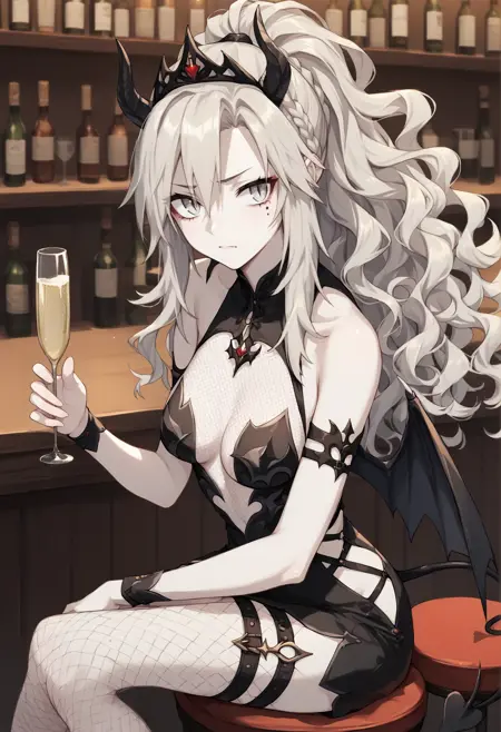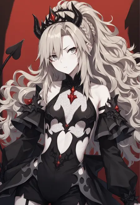 Valentine CE: 창백한 피부, 회색 눈, 회색 머리카락, 긴 머리카락, 곱슬머리, 눈 밑 점, 땋은 머리, 뿔 머리 장식, 악마 날개, 악마 꼬리, 짧은 드레스, 등이 드러난 드레스, 피쉬넷 팔 장식, 비대칭 팔 장식, 비대칭 다리 장식