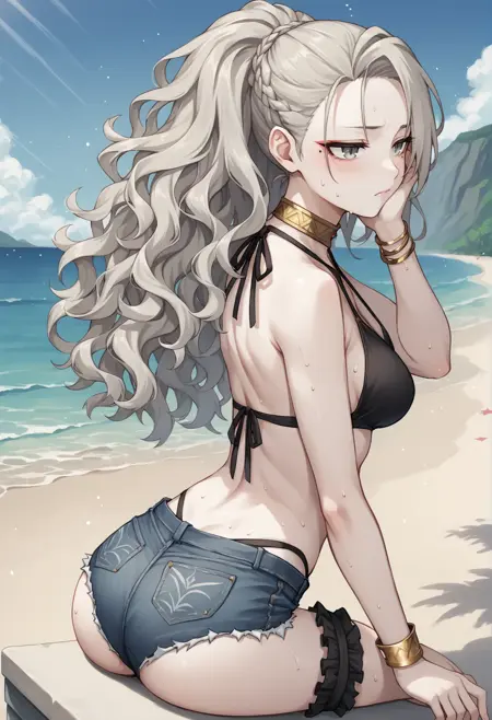 Swimsuit1: 창백한 피부, 회색 눈, 회색 머리카락, 긴 머리카락, 곱슬머리, 눈 밑 점, 두 줄기 머리, 꽃 머리 장식, 검은 비키니, 긴 소매, 언더부브, 사롱, 장갑, 비대칭 다리 장식